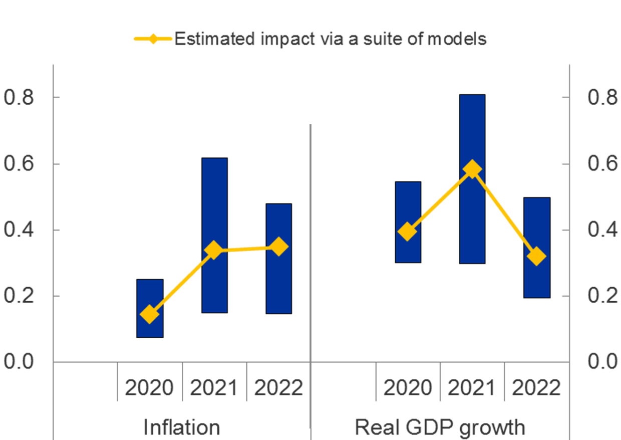 Die Ergebnisse zeigen, dass wir den Zinssatz für die Einlagefazilität um mehr als einen vollen Prozentpunkt auf circa -1,7% – von derzeit -0,5% – hätten senken müssen, um dieselbe Wirkung auf die Inflation zu erzielen (Grafik 9).