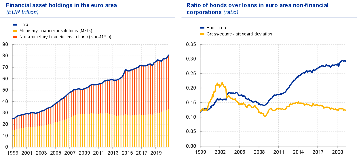 In the early years of the common currency, the bulk of financial assets were held on the balance sheets of banks. But since the global financial crisis in 2008, the overall growth in financial assets can almost entirely be traced to non-bank entities which by now represent more than half of the total financial asset holdings in the euro area.[3]