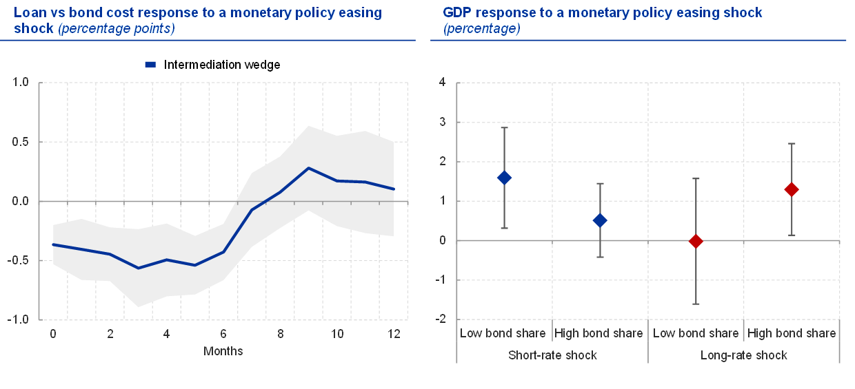 Notes: Charts show impulse response functions (IRFs) to a monetary policy easing shock, identified via high-frequency surprises in a panel local projections model, using monthly data for euro area countries, that leads to a 25 basis point fall in interest rates. Shocks refer to surprises in the one-month overnight index swap (OIS) rate, except for the “long-rate shock” which refers to five-year Bund yields. Intermediation wedge is the difference between a loan-financing vs bond-financing spread. Bond share is the ratio of bond volume to the sum of bond and loan volumes in non-financial corporation (NFC) sector of each country. Low (high) bond share refers to lower (upper) quintile of cross-country bond share distribution. The range in the left-hand panel denotes the 90% confidence interval. IRFs in the right-hand panel are smoothed. Diamonds are point estimates; whiskers are 90% confidence intervals.