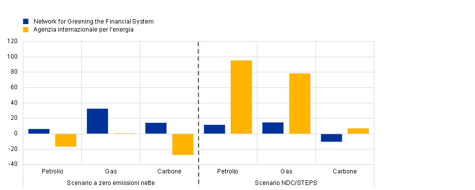 Note: proiezioni delle variazioni dei prezzi dei combustibili fossili al lordo delle imposte dal 2020 al 2030. Lo scenario a zero emissioni nette ha carattere ambizioso e limita il riscaldamento globale a 1,5 gradi centigradi, raggiungendo l’azzeramento delle emissioni nette entro il 2050. Lo scenario elaborato dall’NGFS in base ai contributi determinati a livello nazionale (nationally determined contributions, NDC) ha carattere meno ambizioso e prevede che gli impegni derivanti dalle politiche climatiche generino un riscaldamento globale pari a circa 2,5 gradi centigradi. Lo scenario basato sulle dichiarazioni delle politiche (stated policies scenario, STEPS) elaborato dall’AIE è utilizzato quale scenario più prossimo allo scenario NDC. Per gli scenari dell’NGFS la figura mostra la media dei tre modelli principali.