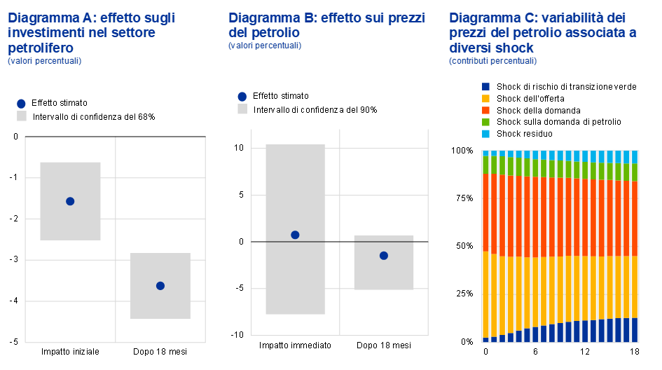 Secondo analisi recenti, la transizione ecologica avrebbe influenzato gli investimenti nel settore dei combustibili fossili in misura solo limitata. Negli ultimi anni le aspettative sulla transizione potrebbero aver provocato una caduta degli investimenti nel settore petrolifero, probabilmente per effetto del maggiore costo da sostenere per attrarre risorse finanziarie[36]. Al tempo stesso, si stima che uno shock simile a quello che sarebbe necessario per rispettare l’Accordo di Parigi avrebbe sugli investimenti petroliferi un effetto trascurabile nel breve termine – tra l’1 e il 2 per cento del volume degli investimenti complessivi – per poi aumentare in misura comunque limitata (figura 4, diagramma A)[37].