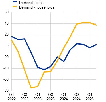 In terms of credit volumes, household borrowing, primarily for home purchases, has increased steadily. According to the bank lending survey (BLS), the recovery in mortgage demand is supported by improved housing market prospects and lower interest rates (Chart 3, panel A). Corporate borrowing is also gradually recovering, though BLS responses suggest that corporate demand for credit remains subdued, also reflecting global uncertainty and trade tensions.[5]