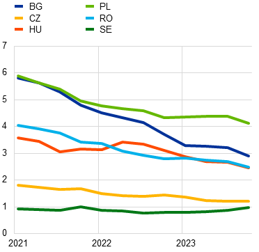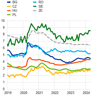 Il y a lieu de signaler que la Belgique et le Danemark pourraient également être considérés comme des exceptions puisque, en mai 2024, les taux d’inflation moyens sur douze mois dans ces deux pays étaient sensiblement inférieurs à la moyenne de la zone euro (de, respectivement, 1,5 et 2,3 points de pourcentage). Dans ces deux pays, la grande différence en termes de dynamique de l’inflation par rapport à la zone euro s’explique principalement par des replis plus importants de la composante énergétique de l’IPCH, en raison d’une répercussion plus rapide des prix de gros sur les prix de détail de l’énergie, ce qui reflète principalement les caractéristiques spécifiques des contrats d’énergie.
