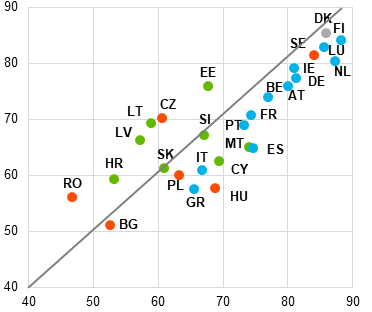 Mesurer la qualité institutionnelle est difficile et implique inévitablement une part de jugement. D’une part, les indicateurs fondés sur la perception peuvent présenter certains mérites par rapport à d’autres indicateurs. Un des avantages des enquêtes fondées sur la perception tient à leur portée générale, alors que des mesures plus spécifiques risquent de fournir des informations très déformées. De plus, si la valeur en termes absolus des indicateurs fondés sur la perception est discutable, ces indicateurs sont toutefois utiles pour les comparaisons entre pays, à moins qu’il n’existe un biais systématique manifeste à l’encontre d’un ou de plusieurs pays en particulier. En outre, les indicateurs uniquement fondés sur le contenu de la législation, et non sur une connaissance détaillée de sa mise en œuvre effective, peuvent être trompeurs. Et dans la mesure où aucun modèle institutionnel ne peut être considéré comme préférable ex ante, les enquêtes fondées sur la perception peuvent prévenir l’émergence de biais de mesure lors de l’évaluation directe des différentes dimensions de la gouvernance économique. D’autre part, les enquêtes fondées sur la perception produisent également des distorsions. Par exemple, elles peuvent être fortement influencées par un épisode récent ou des questions mal conçues. De plus, s’agissant des pays de l’UE, l’intérêt porté aux institutions n’a gagné en importance au plan analytique et en matière de politique économique que ces dernières années. Il existe encore, de manière générale, une importante marge d’amélioration des mesures. Enfin, les approches par pays d’une question aussi complexe que la qualité des institutions ou la bonne gouvernance sont nécessairement légèrement insuffisantes et nécessitent à l’évidence d’être complétées par des évaluations plus spécifiques à chaque pays et à plus long terme. Dans le même temps, les difficultés de mesure ne devraient pas conduire à minimiser ces déterminants essentiels de la prospérité, de l’équité sociale et du bien-être à long terme.