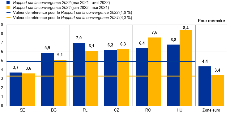 Premièrement, en ce qui concerne « un taux d’inflation moyen, observé au cours d’une période d’un an avant l’examen », le taux d’inflation a été calculé sur la base de la variation de la moyenne sur douze mois de l’IPCH durant la période de référence allant de juin 2023 à mai 2024 par rapport à la moyenne précédente sur douze mois. L’inflation a été mesurée au moyen de l’IPCH, mis au point en vue d’évaluer la convergence en termes de stabilité des prix sur une base comparable (cf. section 6.2). Deuxièmement, le concept relatif aux « trois États membres, au plus, présentant les meilleurs résultats en matière de stabilité des prix », utilisé pour la définition de la valeur de référence, a été appliqué en calculant la moyenne arithmétique non pondérée des taux d’inflation des trois États membres présentant les taux d’inflation moyens les plus bas (en excluant les valeurs revêtant un caractère exceptionnel).