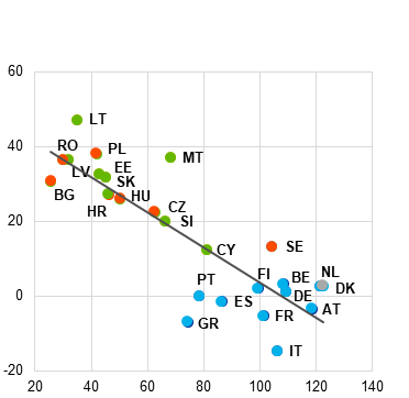 Konverģences novērtēšanai ECB pauž savu viedokli par fiskālajām norisēm. Vērtējot ilgtspēju, ECB aplūko fiskālo norišu galvenos rādītājus no 2014. gada līdz 2023. gadam, prognozes un problēmas valdības finanšu jomā, analizējot saiknes starp deficīta un parāda norisēm. Vērtējot pandēmijas un Krievijas kara pret Ukrainu ietekmi uz valdības finanšu stāvokli, ECB pamatojas uz Stabilitātes un izaugsmes pakta vispārējo izņēmuma klauzulu, kas tika piemērota no 2020. gada 20. marta līdz 2023. gada 31. decembrim. Konkrētāk, attiecībā uz preventīvo daļu pirms reformas īstenošanas 2024. gada aprīlī Regulas (EK) No 1466/97[10] 5. panta 1. punktā un 9. panta 1. punktā noteikts, ka "nopietnas ekonomikas lejupslīdes periodos eurozonā vai Savienībā kopumā dalībvalstīm var uz laiku atļaut pilnībā neveikt .. vidēja termiņa budžeta mērķa sasniegšanai vajadzīgās korekcijas ar noteikumu, ka tādējādi vidējā termiņā netiek apdraudēta fiskālā stabilitāte". Attiecībā uz korektīvo daļu Regulas (EK) Nr. 1467/97 3. panta 5. punktā noteikts, ka, "ja notiek nopietna ekonomikas lejupslīde eurozonā vai Savienībā kopumā, Padome pēc Komisijas ieteikuma var arī izlemt pieņemt pārskatītu ieteikumu atbilstoši LESD 126. panta 7. punktam ar nosacījumu, ka tas neapdraud fiskālo stabilitāti vidējā termiņā", bet Regulas (EK) Nr. 1467/97 5. panta 2. punktā noteikts, ka, "ja notiek nopietna ekonomikas lejupslīde eurozonā vai Savienībā kopumā, Padome pēc Komisijas ieteikuma var arī izlemt pieņemt pārskatītu pieprasījumu atbilstoši LESD 126. panta 9. punktam ar nosacījumu, ka tas neapdraud fiskālo stabilitāti vidējā termiņā". Papildus ECB veic valsts budžeta struktūru efektivitātes analīzi saskaņā ar Regulas (EK) Nr. 1467/97 2. panta 3. punkta b) apakšpunktu un Direktīvu 2011/85/ES[11]. Minētais 126. pants neattiecas uz ECB, kas atšķirībā no Komisijas nav oficiāli iesaistīta pārmērīga budžeta deficīta novēršanas procedūrā. Tāpēc ECB ziņojumā tikai norādīts, vai valsts pakļauta pārmērīga budžeta deficīta novēršanas procedūrai.