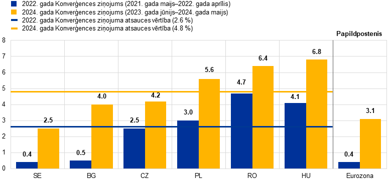 Pirmkārt, minēto vidējo inflācijas līmeni vienā gadā pirms novērtējuma aprēķina, izmantojot 12 mēnešu vidējā SPCI rādītāja pārmaiņas atsauces periodā no 2023. gada jūnija līdz 2024. gada maijam salīdzinājumā ar iepriekšējo 12 mēnešu vidējo rādītāju. Inflāciju nosaka, pamatojoties uz SPCI, ko ieviesa konverģences novērtēšanai cenu stabilitātes jomā, izmantojot salīdzināšanas metodi (sk. 6.2. iedaļu). Otrkārt, nosacījumu "augstākais, tādu triju dalībvalstu dati, kurās cenu stabilitāte ir vislielākā", kas izmantots atsauces vērtības definīcijā, piemēro, izmantojot to triju dalībvalstu, kurām ir viszemākais vidējais inflācijas līmenis, nesvērto aritmētisko vidējo inflāciju (izņemot izlecošās vērtības).