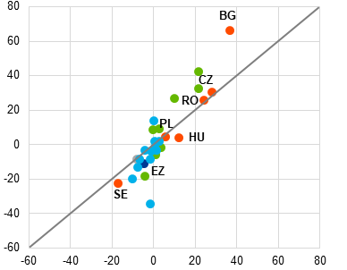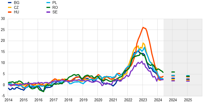 Jāatzīst, ka būtu iespējams arī Beļģiju un Dāniju uzskatīt par izlecošajām vērtībām, ņemot vērā to, ka 12 mēnešu vidējās inflācijas rādītājs šajās valstīs 2024. gada maijā bija būtiski zemāks par eurozonas vidējo līmeni (attiecīgi par 1.5 un 2.3 procentpunktiem). Lielās atšķirības inflācijas dinamikā salīdzinājumā ar eurozonu šajās valstīs galvenokārt noteica būtiskāks SPCI enerģijas komponenta kritums, ko izraisīja straujāka vairumtirdzniecības enerģijas cenu pārnese uz mazumtirdzniecības enerģijas cenām, galvenokārt atspoguļojot enerģijas piegādes līgumu specifiskās iezīmes.