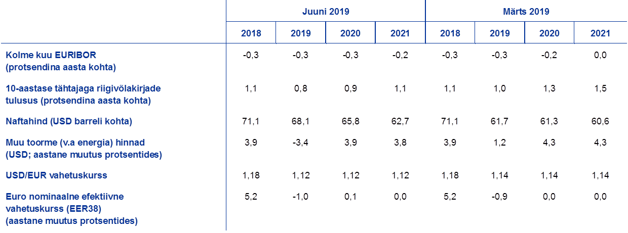 2019. aasta märtsi ettevaatega võrreldes hõlmavad tehnilised eeldused naftahinna tõusu ja madalamaid intressimäärasid. Tehnilised eeldused intressimäärade ja toormehindade kohta põhinevad turgude ootustel seisuga 15. mai 2019. Lühiajalisi intressimäärasid mõõdetakse kolme kuu EURIBORina ja turgude ootused tuletatakse futuurilepingute intressimääradest. Selle meetodi kohaselt on lühiajaliste intressimäärade keskmine tase 2019. ja 2020. aastal –0,3% ning 2021. aastal –0,2%. Turgude ootuste järgi peaks euroala riikide kümneaastase tähtajaga võlakirjade nominaalne intressimäär olema 2019. aastal keskmiselt 0,8%, 2020. aastal 0,9% ning 2021. aastal 1,1%.[2] 2019. aasta märtsi ettevaatega võrreldes on turgude ootusi lühiajaliste intressimäärade arengu suhtes korrigeeritud 2020. ja 2021. aastaks vastavalt 10 ja 20 baaspunkti võrra allapoole; euroala riikide kümneaastase tähtajaga võlakirjade nominaalseid intressimäärasid on korrigeeritud 2019. ja 2020. aastaks 30 baaspunkti võrra ning 2021. aastaks 40 baaspunkti võrra allapoole.