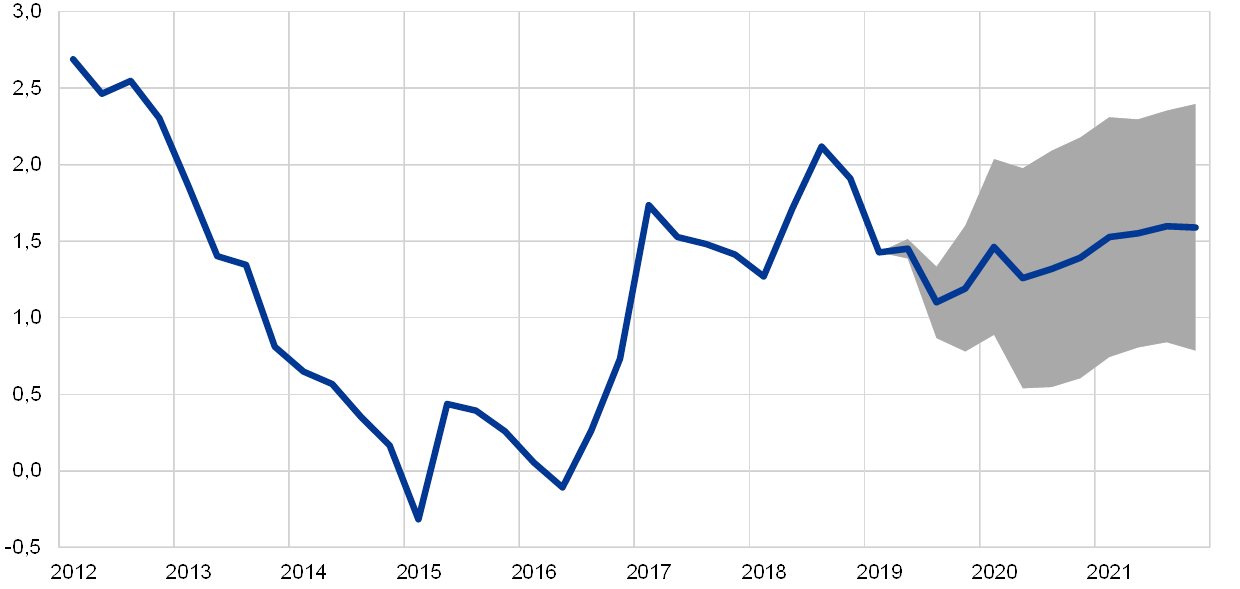 ÜTHI-inflatsioon peaks 2019. aastal aeglustuma, kuid edaspidi elavnema ja kiirenema 2021. aastal 1,6%ni. Energiahindade inflatsioon aeglustub negatiivsete baasefektide ja naftahinna arenguga seotud veidi tagasihoidlikumate eelduste taustal lühiajaliselt ning stabiliseerub seejärel. ÜTHI-inflatsioon (v.a energia ja toiduained) hoogustub prognoositava majanduskasvu toetusel aegamisi. Samal ajal kandub tööjõukulude varasema tõusu mõju hindadesse ja kasumimarginaalide kasv elavneb. 2019. aasta märtsi ettevaatega võrreldes on ÜTHI-inflatsiooni 2019. aasta prognoosi korrigeeritud kõrgema naftahinna tõttu veidi ülespoole ja 2020. aasta prognoosi veidi allapoole, võttes arvesse naftahinna eeldatava arengukõvera järsemat langust. ÜTHI-inflatsiooni (v.a energia ja toiduained) prognoosi on lühiajaliselt mõnevõrra allapoole korrigeeritud. Selle põhjuseks on kehvemate andmete laekumine.[1]