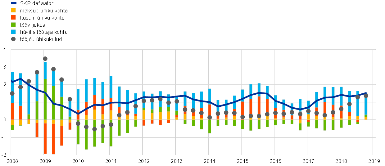 Kasumitel võib olla oluline roll inflatsiooni arengu kujundamisel ja selles, mil määral palgasurve kandub üle hindadesse. SKP deflaatoris, mille abil euroala hinnasurvet mõõdetakse, saab vaadelda nii tööjõukulude, kasumite kui ka maksude mõju osakaalu (vt diagramm A). Ühiku kohta arvestatava kasumi (tegevuse koguülejääk jagatuna reaalse SKPga) kasvav osatähtsus selgitas suurel määral SKP deflaatori inflatsiooninäitaja tugevnemist aastatel 2016 ja 2017, ning ühiku kohta arvestatava kasumi osatähtsuse vähenemine 2018. aastal selgitab, miks euroalasisene hinnasurve püsis põhimõtteliselt stabiilsena hoolimata nii palkade kui ka tööjõu ühikukulude kasvu jõulisest hoogustumisest. See osutab ühiku kohta arvestatava kasumi puhvrirollile.