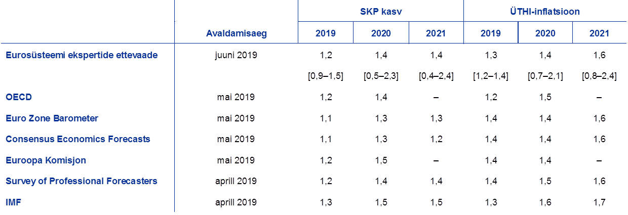 Allikad: OECD Economic Outlook (mai 2019), MJEconomics (euroala baromeeter, 2019. aasta mai uuring 2019. ja 2020. aasta kohta ning 2019. aasta aprilli uuring 2021. aasta kohta), Consensus Economics Forecasts (2019. aasta mai uuring 2019. ja 2020. aasta kohta ning 2019. aasta aprilli uuring 2021. aasta kohta), Euroopa Komisjoni majandusprognoos (kevad 2019), EKP Survey of Professional Forecasters (2019. aasta teine kvartal) ning IMFi World Economic Outlook (aprill 2019).