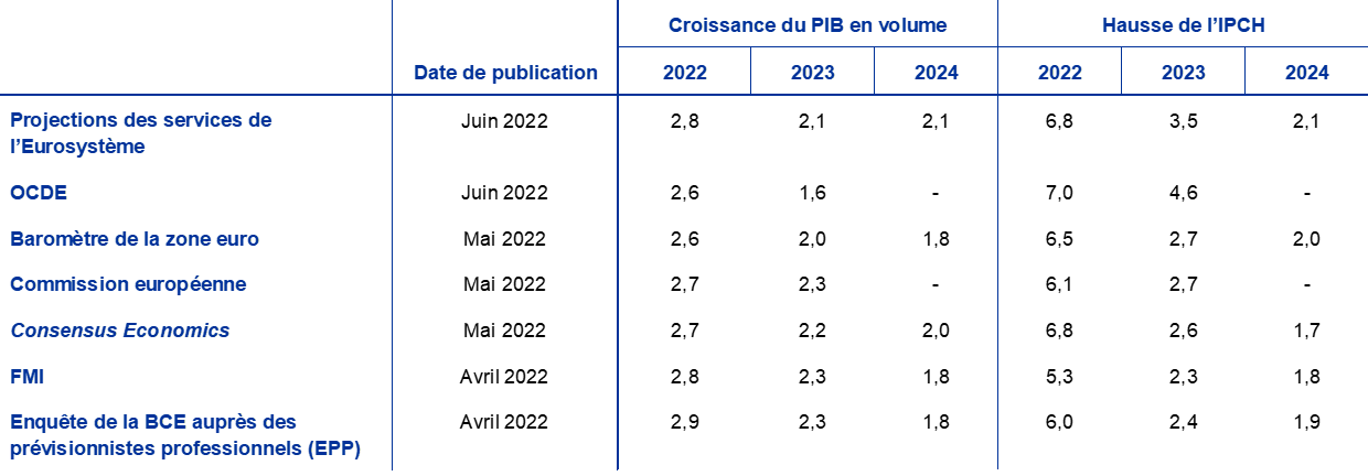 Sources : Perspectives économiques de l’OCDE, no 111, 8 juin 2022 ; MJEconomics pour le baromètre de la zone euro, 26 mai 2022 (les données relatives à 2024 sont tirées de l’enquête d’avril 2022) ; Prévisions économiques de la Commission européenne (printemps 2022), 16 mai 2022 ; Consensus Economics, 12 mai 2022 (les données relatives à 2024 sont tirées de l’enquête d’avril 2022) ; FMI, Perspectives de l’économie mondiale, 19 avril 2022 ; ECB, Survey of Professional Forecasters (enquête menée par la BCE auprès des prévisionnistes professionnels pour le second trimestre 2022), 15 avril 2022.
