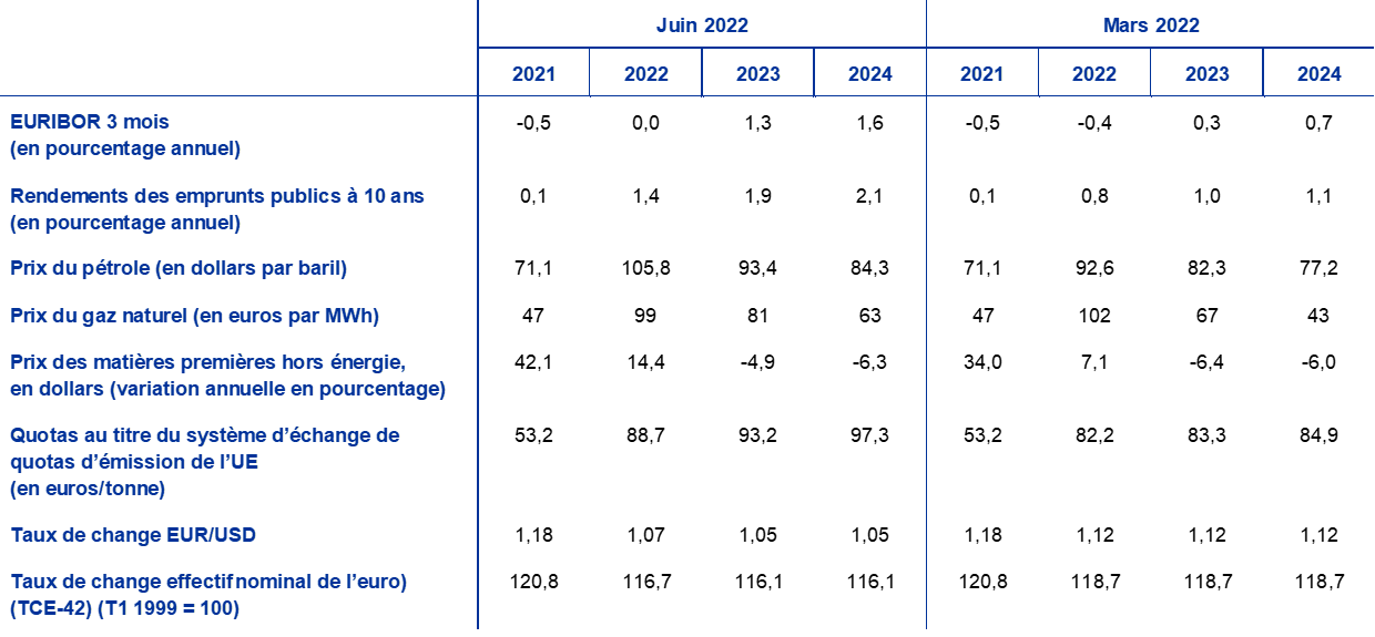 Les taux de change bilatéraux devraient rester stables sur l’horizon de projection, aux niveaux moyens relevés pendant les dix jours ouvrés précédant la date d’arrêté. Cette hypothèse implique un taux de change moyen de l’euro vis-à-vis du dollar de 1,07 en 2022 et de 1,05 en 2023 et 2024, inférieur d’environ 6 % aux projections de mars 2022. L’hypothèse relative au taux de change effectif de l’euro suppose une dépréciation de 2 % par rapport aux projections de mars 2022.