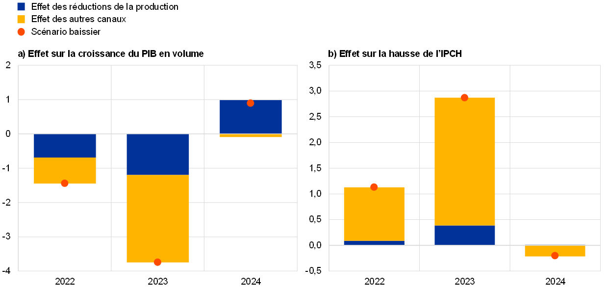 En ce qui concerne l’inflation, un important renchérissement des matières premières entraînerait de vives tensions haussières sur les prix, prolongeant la période attendue de forte augmentation des prix. La hausse des prix de l’énergie et des matières premières alimentaires ainsi que les interruptions de la production liées à l’énergie se traduiraient par une inflation globale nettement plus forte que dans les projections de référence en 2022 et, surtout, en 2023 (cf. graphique A). Les effets indirects différés du renchérissement de l’énergie et des produits alimentaires devraient également maintenir l’inflation mesurée par l’IPCH hors énergie et produits alimentaires à des niveaux élevés pendant plus longtemps, ce qui compenserait largement les pressions à la baisse exercées par l’affaiblissement de la demande et la hausse du chômage. Néanmoins, une trajectoire baissière des prix de l’énergie, accompagnée de pressions à la baisse sur la demande, dominerait en 2024, les taux de hausse de l’IPCH et de l’IPCH hors énergie et produits alimentaires revenant en deçà du scénario de référence.