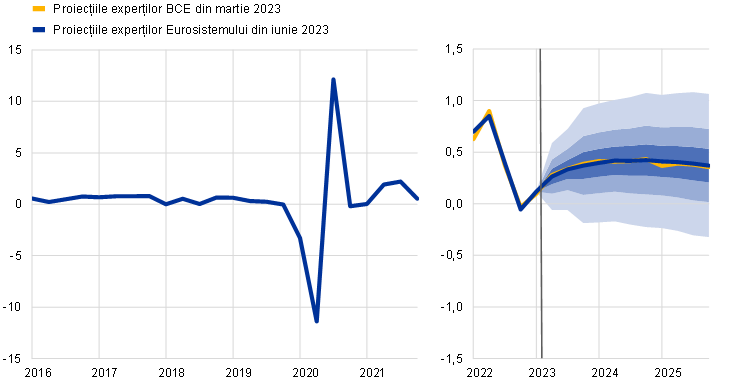 Notă: Datele istorice pot fi diferite de cele mai recente date publicate de Eurostat (a se vedea nota de subsol 2). Linia verticală indică începutul orizontului actual de proiecție. Intervalele din jurul proiecțiilor centrale oferă o măsură a gradului de incertitudine și sunt, prin definiție, simetrice. Acestea se bazează pe erori de proiecție anterioare, după ajustarea cu valorile extreme. Intervalele de variație, de la nuanțele cele mai închise la cele mai deschise, prezintă probabilitățile de 30%, 60% și 90% conform cărora rezultatul creșterii PIB real se va încadra în intervalele respective. Pentru mai multe informații, a se vedea Caseta 6 din proiecțiile macroeconomice pentru zona euro ale experților BCE din luna martie 2023.