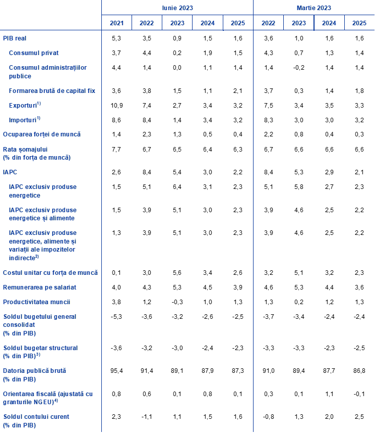 Proiecțiile experților Eurosistemului din luna iunie 2023 presupun o creștere a PIB real în zona euro de 0,1% în trimestrul I 2023, cu 0,2 puncte procentuale peste estimarea Eurostat publicată la 8 iunie 2023, după data-limită pentru proiecții. Această discrepanță reflectă, în mare măsură, faptul că proiecțiile pentru mai multe țări mai mici din zona euro cu date trimestriale deosebit de volatile, care fac adesea obiectul unor revizuiri semnificative, sunt realizate cu frecvență anuală și interpolate în scopul elaborării de proiecții trimestriale pentru zona euro. Această abordare implică un profil trimestrial mai moderat decât cel consemnat în estimările oficiale ale Eurostat, care se bazează pe informații trimestriale pentru toate țările din zona euro. În plus, unele date la nivel de țară au devenit disponibile numai după data-limită pentru proiecțiile din luna iunie 2023.