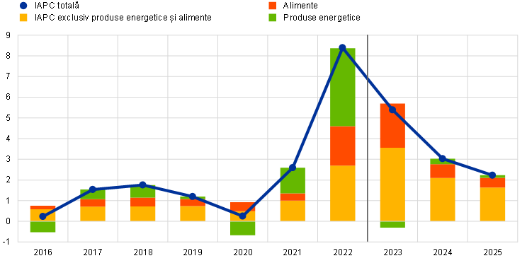 Inflația măsurată prin indicele armonizat al prețurilor de consum (IAPC) se dovedește a fi mai persistentă decât s-a anticipat anterior, în pofida scăderii prețurilor produselor energetice și a atenuării blocajelor la nivelul ofertei. În condițiile în care se așteaptă ca dinamica prețurilor produselor energetice să coboare tot mai adânc în teritoriul negativ pe tot parcursul anului 2023, iar cea a prețurilor alimentelor să consemneze o temperare pronunțată, se previzionează că inflația totală va continua să se reducă, până la circa 3% în ultimul trimestru al anului. Cu toate acestea, conform proiecțiilor, inflația IAPC exclusiv produse energetice și alimente va depăși inflația totală pe termen scurt și se va menține la niveluri superioare acesteia până la începutul anului 2024, deși va urma o traiectorie descendentă graduală începând cu a doua jumătate a acestui an. Pe măsura estompării treptate a efectelor indirecte exercitate de șocurile anterioare ale prețurilor produselor energetice și de alte presiuni inflaționiste din partea costurilor, care se află la baza scăderii anticipate, costurile cu forța de muncă vor deveni principalul factor determinant al inflației IAPC exclusiv produse energetice și alimente. Se anticipează că dinamica salarială se va menține peste dublul mediei sale istorice pentru cea mai mare parte a orizontului de proiecție, ca urmare a măsurilor de compensare a inflației și a condițiilor restrictive de pe piața forței de muncă, precum și a majorărilor salariilor minime. Cu toate acestea, se estimează că marjele de profit, care au înregistrat o creștere semnificativă în 2022, vor acționa, parțial, ca un amortizor împotriva propagării acestor costuri pe termen mediu. În plus, politica monetară ar trebui să frâneze în continuare inflația de bază în anii următori. În ansamblu, se anticipează că inflația totală se va reduce, în medie, de la 8,4% în anul 2022 la 5,4% în 2023, la 3,0% în 2024 și la 2,2% în 2025. Comparativ cu proiecțiile din luna martie 2023, aceasta a fost revizuită în sens ușor ascendent pe parcursul întregului orizont de proiecție. Această evoluție se datorează în principal unei revizuiri semnificative în sens ascendent a inflației IAPC exclusiv produse energetice și alimente, care reflectă revizuiri generate de rezultatele recente peste așteptări privind inflația și de o ușoară majorare a costurilor unitare cu forța de muncă, care anulează complet efectul ipotezelor privind reducerea prețurilor produselor energetice și al condițiilor de finanțare mai restrictive.