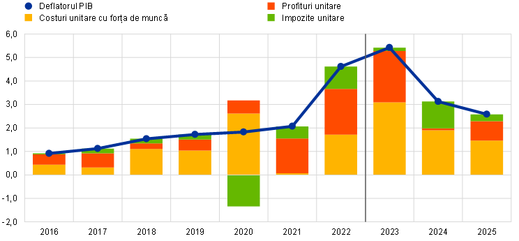 7. Pentru mai multe informații privind descompunerea deflatorului PIB și rolul profiturilor unitare în analiza inflației, a se vedea Arce, O., Hahn, E. și Koester, G., „How tit-for-tat inflation can make all worse”, Blogul BCE, 30 martie 2023, precum și caseta intitulată „How do profits shape domestic price pressures in the euro area?”, Buletin economic, ediția 6/2019, BCE, și cea intitulată „The role of profit margins in the adjustment to the adjustment to the COVID-19 shock”, Buletin economic, ediția 2/2021, BCE, ambele casete având-o ca autoare pe E. Hahn.