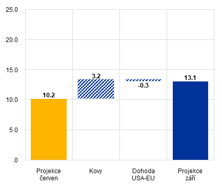 • Celková efektivní celní sazba USA na dovoz zboží od všech obchodních partnerů vzrostla z 16,8 % v červnových projekcích na 21,0 % (viz graf A, panel b). To odráží zdvojnásobení plošných cel na ocel a hliník (z 25 % v projekcích z června 2025 na 50 %) a doplnění 407 derivátů oceli a hliníku na seznam výrobků zasažených celní sazbou, nová plošná cla na měď (50 %), dvoustranné obchodní dohody podepsané s klíčovými obchodními partnery (např. s Evropskou unií, Japonskem, Jižní Koreou a Vietnamem), vyšší vzájemné sazby zavedené 7. srpna v případě zemí, s nimiž nebylo dosaženo žádné obchodní dohody (např. u Indie a Švýcarska), zvýšení cel na brazilský vývoz (na 50 %) a kanadský vývoz (zvýšení cla na zboží, které není v souladu s dohodou mezi Spojenými státy, Mexikem a Kanadou, na 35 %) a sekundární cla na Indii (navýšení o dalších 25 procentních bodů) s cílem penalizovat její nákupy ruské ropy.