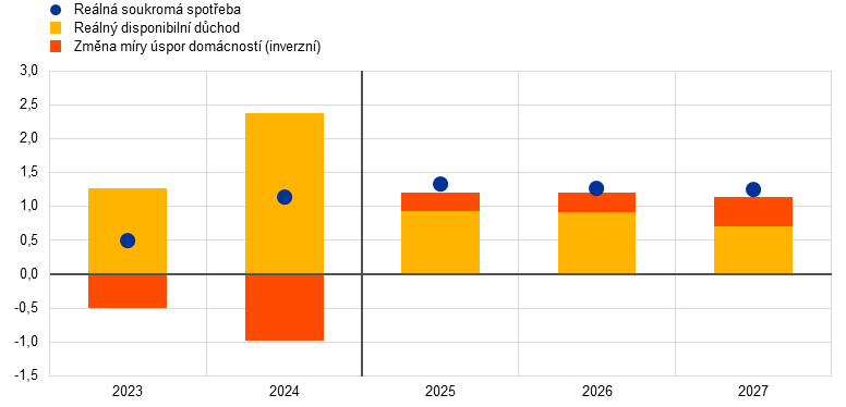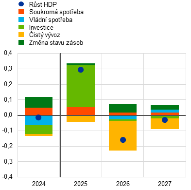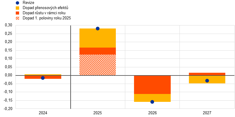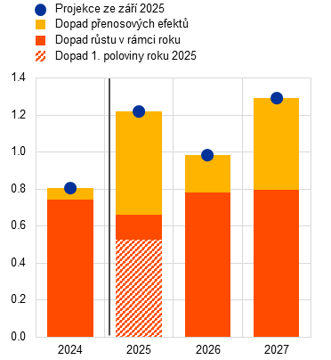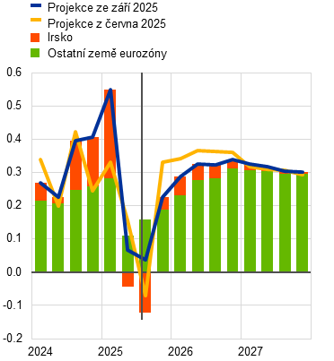 Obchodní cla a související nejistota přispěly během první poloviny roku 2025 k výrazným výkyvům hospodářské aktivity a jejímu uspíšení, zejména v Irsku. Odeznívání těchto faktorů ve druhé polovině roku by mělo přinést další volatilitu, která znesnadňuje interpretaci signálů o základní dynamice hospodářství eurozóny. Odhlédneme-li od volatility způsobené výkyvy údajů o Irsku, hospodářský růst ve zbytku eurozóny byl stabilnější a očekává se, že tomu tak bude i ve druhé polovině roku. I když nová obchodní dohoda mezi USA a EU přináší vyšší cla na vývoz z eurozóny do Spojených států, pomohla snížit nejistotu v oblasti obchodní politiky. Později ve sledovaném období by měl hospodářský růst v eurozóně za podpory několika faktorů posilovat. Rostoucí reálné mzdy a zaměstnanost spolu s novými vládními výdaji na infrastrukturu a obranu (zejména v Německu) by měly posílit domácí poptávku v eurozóně. Dále se předpokládá, že výhled hospodářského růstu podpoří také méně restriktivní podmínky financování, které odrážejí především nedávná měnová rozhodnutí, a oživení zahraniční poptávky v roce 2027. Průměrné meziroční tempo růstu reálného HDP by mělo dosáhnout úrovně 1,2 % v roce 2025, 1,0 % v roce 2026 a 1,3 % v roce 2027. V porovnání s makroekonomickými projekcemi odborníků Eurosystému z června 2025 byl výhled růstu HDP pro rok 2025 revidován o 0,3 procentního bodu směrem nahoru, což odráží lepší aktuální údaje, než se očekávalo, a přenosový efekt revizí údajů za minulá období. Vzhledem k tomu, že ne všechna překvapivá data se týkají výraznějšího uspíšení hospodářské aktivity oproti předpokladům, očekává se, že ve druhé polovině roku budou kompenzována pouze částečně. Posílení eura a slabší zahraniční poptávka (částečně související s poněkud vyššími cly oproti předpokladům v červnových projekcích) vedly pro rok 2026 k revizi o 0,1 procentního bodu směrem dolů. Projekce pro rok 2027 zůstává beze změny.[1]