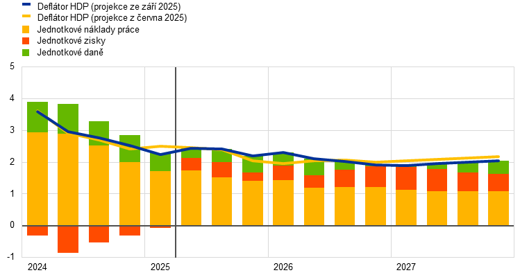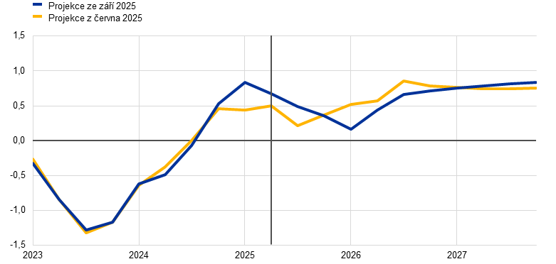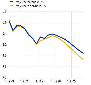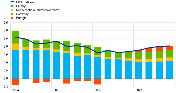 Výhled inflace odpovídá tomu, že se inflace stabilizuje poblíž 2% střednědobého cíle. Celková inflace, měřená harmonizovaným indexem spotřebitelských cen (HICP), by měla po zbytek roku 2025 kolísat poblíž 2 %, v roce 2026 klesnout na 1,7 % a následně se v roce 2027 zotavit na úroveň 1,9 %. Pokles v roce 2026 odráží další postupné snižování cen neenergetických složek, zatímco růst cen energií by měl zůstat volatilní, ale v horizontu projekcí by měl zesílit, částečně v důsledku spuštění systému EU pro obchodování s emisemi ETS2 v roce 2027. Očekává se, že ceny potravin zpočátku i nadále porostou rychleji, neboť se projeví zpožděné dopady dřívějšího růstu cen mezinárodních potravinářských komodit. V letech 2026 a 2027 by však růst měl zmírnit na úroveň mírně nad 2 %. Inflace měřená HICP bez započtení energií a potravin (HICPX) by měla klesat s tím, jak poleví mzdové tlaky a zmírní se růst cen služeb a jak se posilování eura projeví v cenovém řetězci a omezí růst cen zboží. Očekává se, že nižší růst mezd vyplývající z již realizované kompenzace ztrát reálných mezd v minulosti a oživení růstu produktivity povedou k výrazně pomalejšímu růstu jednotkových mzdových nákladů. V porovnání s projekcemi z června 2025 byl výhled celkové inflace měřené HICP revidován pro rok 2025 i 2026 o 0,1 procentního bodu směrem nahoru. Důvodem jsou vyšší aktuální údaje o cenách energetických komodit i předpoklady o jejich budoucím vývoji a také zpožděné účinky vyšších mezinárodních cen potravinářských komodit, které převažují nad posílením eura. Očekává se, že v roce 2027 budou převládat zpožděné účinky posilování eura, což povede k revizi o 0,1 procentního bodu směrem dolů.