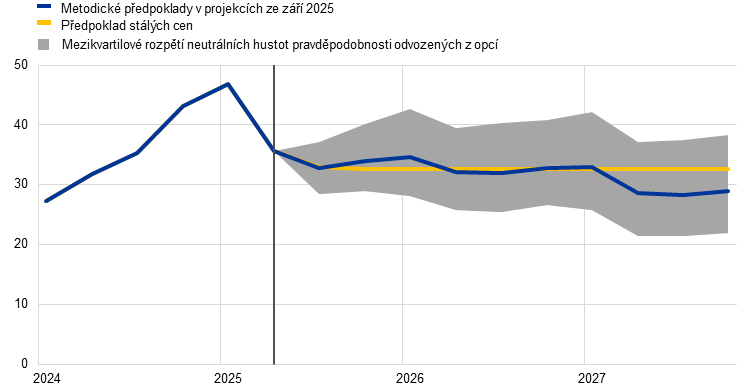 V porovnání s projekcemi z června 2025 jsou hlavními změnami metodických předpokladů vyšší ceny ropy, nižší ceny plynu a komodit a silnější směnný kurz eura, ale finanční předpoklady zůstávají víceméně beze změny. Předpoklady o cenách ropy byly pro období 2025–2027 revidovány v průměru přibližně o 3 % a předpoklady o cenách elektřiny přibližně o 2 %, zatímco předpoklady týkající se velkoobchodních cen plynu byly revidovány o něco směrem dolů. Předpokládá se, že cena za povolenky ze systému EU pro obchodování s emisemi ETS1 bude o něco nižší, zatímco u systému EU pro obchodování s emisemi ETS2 zůstala cena beze změny. Ceny neenergetických komodit byly revidovány mírně směrem dolů. Euro vůči americkému dolaru posílilo od červnových projekcí o 3,3 % a v nominálním efektivním vyjádření o 2,3 %. Předpoklady o úrokových sazbách se v zásadě nemění.