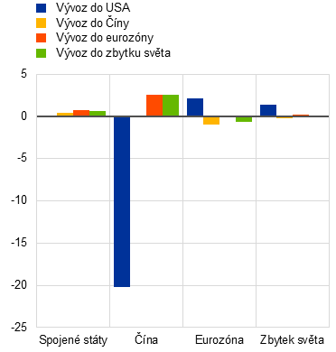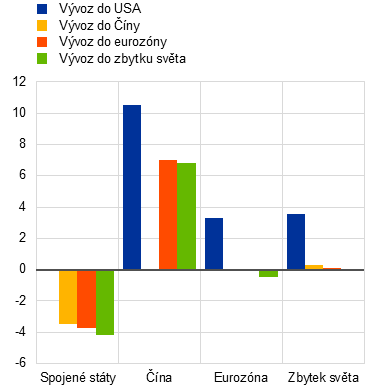 Poznámky: Graf ukazuje změny dvoustranného obchodu ve čtvrtém čtvrtletí 2027 (nevážené). Čína má částečně řízený směnný kurz. Pro zbytek světa je výpočet prováděn za pomoci prostého průměru odchylek vývozu od základní projekce pro všechny regiony v globálním modelu ECB s výjimkou Spojených států, Číny a eurozóny.