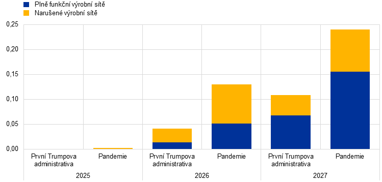 Makroekonomické dopady na eurozónu jsou v případě první alternativní trajektorie minimální, ale výrazné v rámci druhé alternativní trajektorie s extrémnějšími poruchami v dodavatelských řetězcích, stejně jako během pandemie. Zaměříme-li se nejprve na výsledky v případě ekonomiky s plně fungujícími výrobními sítěmi a s využitím modelu ECB-BASE, a to u trajektorie s překážkami v dodávkách podobnými těm během první Trumpovy administrativy, vznikly by pouze minimální inflační tlaky, přičemž inflace měřená HICP by byla v roce 2027 o méně než 0,1 procentního bodu vyšší (graf 20, panel b, modré sloupce). Scénář s podobnými šoky, jaké nastaly během období pandemie, by vedl k výraznějším dopadům na inflaci, přičemž inflace měřená HICP by byla v roce 2027 až o 0,15 procentního bodu vyšší (graf 20, panel b, modré sloupce). V obou citlivostních analýzách je dopad na reálný HDP zanedbatelný nebo mírně kladný a odráží předpoklad nezměněných úrokových sazeb, což při vyšší inflaci implikuje snížení reálných úrokových sazeb, které by hospodářskou aktivitu podpořilo (graf 20, panel a, modré sloupce). Analýza je rozšířena pomocí víceodvětvového modelu pro více zemí, který zohledňuje vstupní a výstupní vazby, přičemž kromě dodavatelských řetězců jsou překážky také ve výrobních sítích. Tento předpoklad snižuje nahraditelnost v rámci výrobních řetězců a vedl by k výraznějším efektům (graf 20, žluté sloupce). V tomto případě by inflace ve srovnání se základním scénářem mohla být v roce 2027 ve scénáři první Trumpovy administrativy až o 0,1 procentního bodu vyšší a v extrémnějším pandemickém scénáři o téměř 0,25 procentního bodu vyšší a růst HDP by byl mírně tlumen.[19]