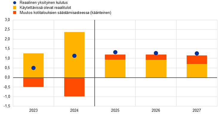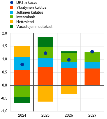 Yksityisen kulutuksen arvioidaan edelleen vauhdittavan BKT:n määrän kasvua. Yksityisen kulutuksen arvioidaan kasvavan vankasti koko arviointijakson ajan ja vaikuttavan eniten BKT:n määrän kasvuun (ks. kuvion 2 kohta a). Lisäksi julkisen kulutuksen ja kokonaisinvestointien ennakoidaan kasvavan joka vuosi vuosina 2025–2027. Vuonna 2027 yksityisten investointien arvioidaan tasoittavan sitä tavanomaista jyrkempää vaikutusta, joka julkisiin investointeihin kohdistuu NGEU-avustusten päättymisen vuoksi. Sen sijaan nettoviennin ennakoidaan vaikuttavan BKT:n kasvuun negatiivisesti vuosina 2025 ja 2026. Tuonnin osuus tästä vaikutuksesta on suurempi (-1,2 prosenttiyksikköä vuonna 2025 ja -0,9 prosenttiyksikköä vuonna 2026) kuin viennin (0,6 prosenttiyksikköä vuonna 2025 ja 0,5 prosenttiyksikköä vuonna 2026). Varastojen muutosten positiivisen vaikutuksen odotetaan kuitenkin osittain tasoittavan nettoviennin negatiivista kasvuvaikutusta vuonna 2025 (ks. kuvion 2 kohta b). Varastojen muutokset vaihtelevat suuresti vuonna 2025, kun niitä ensin kartutetaan viennin etupainotteisuuden vaikutuksesta ja sitten puretaan vaikutuksen laantuessa.