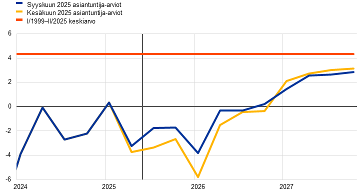 Euroalueen ulkoisen kysynnän näkymät ovat edelleen vaisut. Niitä on myös tarkistettu hieman alaspäin kesäkuun asiantuntija-arvioiden jälkeen. Euroalueen ulkoisen kysynnän kasvun odotetaan heikkenevän vuoden 2024 tasoon (3,6 %) verrattuna. Kasvu hidastuu 2,8 prosenttiin vuonna 2025 ja 1,4 prosenttiin vuonna 2026 ja elpyy sitten 3,1 prosenttiin vuonna 2027 (ks. taulukko 2). Ulkoisen kysynnän kasvuarviota vuodelle 2026 on tarkistettu alaspäin kesäkuun 2025 asiantuntija-arvioiden jälkeen. Vuosille 2025–2027 laadittuihin ulkoisen kysynnän kasvuarvioihin tehdyt kumulatiiviset tarkistukset ovat kuitenkin pienemmät kuin maailmankauppaa koskeviin arvioihin tehdyt tarkistukset. Tämän johtuu viennin maantieteellisen koostumuksen vaikutuksista, sillä Ison-Britannian tuonti oli toisella neljänneksellä odotettua suurempaa ja Keski- ja Itä-Euroopan maiden tuontia koskevia arvioita on korotettu Saksan finanssipoliittisen elvytyksen ja puolustusmenojen vuoksi.