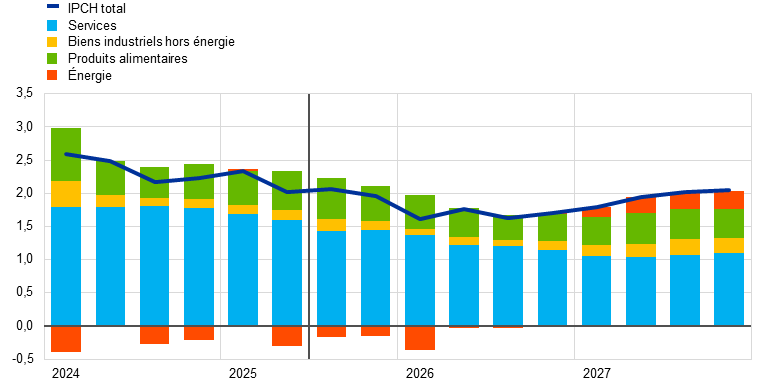 Les perspectives d’inflation sont cohérentes avec une stabilisation de l’inflation autour de l’objectif de 2 % à moyen terme. L’inflation totale, telle que mesurée par l’indice des prix à la consommation harmonisé (IPCH), devrait rester stable, autour de 2 %, pour le reste de 2025, puis diminuer à 1,7 % en 2026 avant de se redresser à 1,9 % en 2027. La baisse en 2026 reflète un nouveau ralentissement progressif des composantes hors énergie, tandis que la hausse des prix de l’énergie devrait rester volatile, mais s’accentuer sur l’horizon de projection, en partie en raison du système d’échange de quotas d’émission de l’UE 2 (SEQE-UE 2), qui démarrera en 2027. L’inflation alimentaire devrait dans un premier temps rester élevée, en raison de la transmission des effets décalés des hausses antérieures des prix des matières premières alimentaires à l’échelle internationale, mais se modérer à des taux légèrement supérieurs à 2 % en 2026 et 2027. L’inflation mesurée par l’IPCH hors énergie et produits alimentaires (IPCHX) devrait ralentir à mesure que les tensions sur les salaires diminuent, que la hausse des prix des services se modère, et que l’appréciation de l’euro se transmet le long de la chaîne des prix et freine le renchérissement des biens. Le ralentissement de la croissance des salaires, les pertes antérieures de salaire réel ayant été compensées, associé à une reprise de la croissance de la productivité, devrait entraîner une nette décélération de la croissance des coûts unitaires de main-d’œuvre. Par rapport aux projections de juin 2025, les perspectives relatives à la hausse de l’IPCH total ont été révisées à la hausse de 0,1 point de pourcentage pour 2025 et 2026 en raison de résultats et d’hypothèses plus élevés concernant les prix des matières premières énergétiques, ainsi que d’effets décalés résultant de l’augmentation des prix des matières premières alimentaires à l’échelle internationale, qui ont plus que compensé l’appréciation de l’euro. Pour 2027, les effets décalés de l’appréciation de l’euro devraient être prédominants, entraînant une révision à la baisse de 0,1 point de pourcentage.