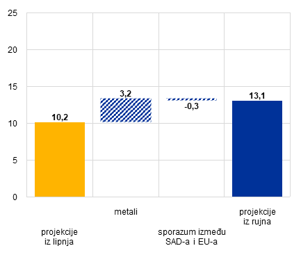 - Pretpostavlja se da će efektivna carinska stopa na izvoz robe iz europodručja u SAD iznositi 13,1 %, što je povećanje u odnosu na 10,2 %, koliko je pretpostavljeno u projekcijama iz lipnja (Grafikon A, dio a)). To je posljedica trgovinskog sporazuma od 27. srpnja 2025. i zajedničke izjave SAD‑a i EU‑a koja je uslijedila, a kojom se predviđa primjena carinske stope od 15 % ili stope za najpovlašteniju naciju, koja god od te dvije stope bila viša, na svu robu koja ne podliježe sektorskim carinama. U projekcijama iz lipnja 2025. pretpostavljena je paušalna carinska stopa od 10 %. Sektorske carine uključuju više carine na čelik i aluminij (povećanje s 25 % u projekcijama iz lipnja na 50 %) i novu carinsku stopu od 50 % na udio aluminija i čelika u 407 proizvoda te općenito na bakar. Na automobile i automobilske dijelove primjenjuje se carinska stopa od 15 % (smanjenje u odnosu na 25 %, koliko je predviđeno u projekcijama iz lipnja) a na zrakoplove i dijelove zrakoplova samo stopa za najpovlašteniju naciju.[4] Pretpostavlja se da će carinska stopa za proizvode koji su trenutačno obuhvaćeni provjerama na osnovi odjeljka 232., a to su farmaceutski proizvodi, poluvodiči i drvo, biti jednaka stopi koja se primjenjivala prije stupanja na dužnost Trumpove administracije, što bi značilo stopu blizu nule. Kada se uzme u obzir i trgovinama uslugama, efektivna carinska stopa povećala se za 1,8 postotnih bodova na 8,1 % u odnosu na razinu predviđenu u projekcijama iz lipnja.