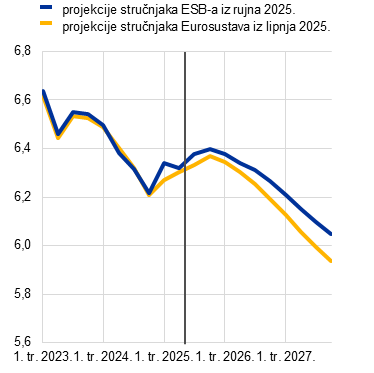 Inflacijski izgledi u skladu su sa stabiliziranjem inflacije na razinama oko srednjoročnog cilja od 2 %. Predviđa se da će ukupna inflacija mjerena harmoniziranim indeksom potrošačkih cijena (HIPC) uglavnom ostati nepromijenjena i iznositi oko 2 % u preostalom dijelu 2025. te da će se potom smanjiti na 1,7 % u 2026. i porasti na 1,9 % u 2027. Smanjenje u 2026. upućuje na daljnje postupno smanjenje komponenata inflacije bez energije. Inflacija cijena energije trebala bi pak i nadalje biti kolebljiva, ali porasti tijekom projekcijskog razdoblja, djelomično zbog uvođenja sustava EU‑a za trgovanje emisijama (ETS2) u 2027. Očekuje se da će inflacija cijena hrane u početku ostati povišena zbog prijenosa odgođenih učinaka prošlih povećanja međunarodnih cijena prehrambenih sirovina, ali da će se u 2026. i 2027. smanjiti na razine malo više od 2 %. Inflacija mjerena HIPC‑om bez energije i hrane trebala bi se smanjiti kako budu popuštali pritisci plaća i smanjivala se inflacija cijena usluga te kako se aprecijacija eura bude prenosila kroz cjenovni lanac i ograničavala inflaciju cijena dobara. Očekuje se da će manji rast plaća, kao posljedica nadoknađivanja prošlog pada realnih plaća, zajedno s oporavkom rasta produktivnosti znatno usporiti rast jediničnih troškova rada. U odnosu na projekcije iz lipnja 2025. izgledi za ukupnu inflaciju mjerenu HIPC‑om revidirani su naviše za 0,1 postotni bod za 2025. i 2026. zbog viših stvarnih i pretpostavljenih cijena energenata te zbog odgođenih učinaka viših međunarodnih cijena prehrambenih sirovina, koji više nego neutraliziraju aprecijaciju eura. Kada je riječ o 2027., predviđa se da će prevladavati odgođeni učinci aprecijacije eura, zbog čega je došlo do revizije naniže za 0,1 postotni bod.