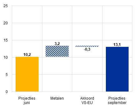 Door de handelsovereenkomst tussen de VS en de EU en andere aangekondigde maatregelen zijn de effectieve Amerikaanse invoerheffingen voor zowel het eurogebied als alle andere handelspartners hoger dan in de projecties van juni 2025. De projecties zijn gebaseerd op de tarieven, opschortingen en uitzonderingen die van kracht waren op de afsluitingsdatum (28 augustus) en zijn voor de gehele projectieperiode gelijk gehouden.