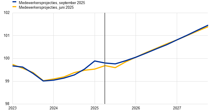 Toelichting: De gegevens zijn gecorrigeerd voor seizoensinvloeden en het aantal werkdagen. Historische cijfers kunnen afwijken van die in de meest recente Eurostat-publicaties wanneer er na de afsluitingsdatum van de projecties nog gegevens gepubliceerd zijn. De verticale lijn geeft het begin van de projectieperiode aan. Bijstellingen worden berekend op basis van niet afgeronde cijfers.