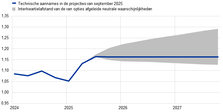 In deze gevoeligheidsanalyse worden de implicaties van alternatieve ontwikkelingen van de wisselkoers beoordeeld, die wijzen op een mogelijke verdere opwaartse druk op de euro en bijgevolg op neerwaartse risico’s voor de groei en de inflatie. De technische aannames voor de wisselkoersen in de basisprojecties worden gedurende de projectieperiode constant gehouden. Alternatieve neerwaartse en opwaartse ontwikkelingen worden afgeleid van het 25e en 75e percentiel van de van opties afgeleide neutrale waarschijnlijkheden voor de USD/EUR-wisselkoers op 15 augustus 2025, die wezen op een appreciatie van de euro (Grafiek 16). De effecten van deze alternatieve ontwikkelingen worden beoordeeld aan de hand van macro-economische modellen van medewerkers van de ECB en het Eurosysteem. Het gemiddelde effect op de outputgroei en de inflatie in deze modellen wordt weergegeven in Tabel 7.