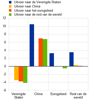 Toelichting: De grafiek toont veranderingen in de bilaterale handel in het vierde kwartaal van 2027 (ongewogen). China heeft een geleide zwevende wisselkoers. De rest van de wereld wordt berekend als het rekenkundig gemiddelde van de afwijkingen van de uitvoer ten opzichte van het basisscenario voor alle regio’s in het Global-model van de ECB met uitzondering van de Verenigde Staten, China en het eurogebied.