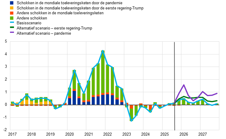 Er kunnen zich knelpunten aan de aanbodzijde voordoen wanneer nieuwe heffingen, handelsverstoringen en toegenomen onzekerheid bedrijven ertoe aanzetten hun toeleveringsketens te herstructureren, wat in ieder geval tijdelijk tot een zekere vermindering van de doeltreffendheid van de productie kan leiden. Er zijn momenteel geen tekenen van significante knelpunten in de mondiale toeleveringsketens, en het onlangs overeengekomen handelsakkoord tussen de VS en de EU heeft de kans verkleind dat het eurogebied door dergelijke verstoringen wordt getroffen. Het basisscenario gaat dan ook niet uit van significante knelpunten in het aanbod. Gezien de omvang van de Amerikaanse heffingen die opgelegd zijn aan enkele landen met een sleutelrol in de mondiale toeleveringsketens, alsook de mogelijkheid van een verdere escalatie van het handelsconflict, kunnen dergelijke verstoringen niet worden uitgesloten. Om dit risico te beoordelen, stellen we twee alternatieve scenario’s op rond het basisscenario van de Global Supply Chain Pressure Index (GSCPI)[17], met behulp van een groot, structureel Bayesiaans vector-autoregressiemodel (BVAR) op basis van de projecties van september 2025 (Grafiek 19).[18] Met het basisscenario zou de GSCPI gedurende de projectieperiode rond het huidige niveau liggen, wat betekent dat er beperkte effecten zijn op de bedrijvigheid in het eurogebied. Een eerste alternatief scenario wordt gecreëerd door schokken toe te passen op de mondiale toeleveringsketen tijdens de eerste regering-Trump (gele balken in Grafiek 19), zoals vastgesteld door het BVAR-model, toe te passen op het basisscenario. Een tweede alternatief scenario biedt een model voor ernstige knelpunten in de toeleveringsketen, die een afspiegeling vormen van de schokken die tijdens de coronapandemie werden waargenomen (blauwe balken in Grafiek 19). Dit is een extreme aanname, aangezien de kans op een dergelijke schok momenteel zeer laag wordt ingeschat.