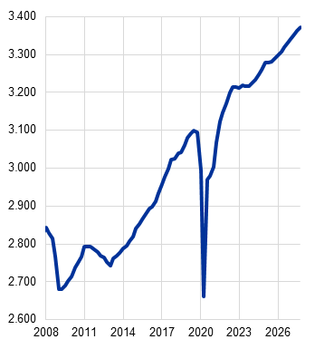 Onder invloed van aanhoudend lage Chinese uitvoerprijzen stijgen de uitvoerprijzen van concurrenten van het eurogebied minder snel dan het historisch gemiddelde. De uitvoerprijzen van concurrenten van het eurogebied (in nationale valuta) nemen volgens de projecties toe met 1,6% in 2025, 2,1% in 2026 en 2,3% in 2027. Dit ligt onder het historische gemiddelde (2,6% in de periode 2000-2019), aangezien de inflatie van de Chinese uitvoerprijzen naar verwachting tot eind 2026 negatief blijft. De neerwaartse bijstellingen voor 2025 en 2026 ten opzichte van de projecties van juni 2025 weerspiegelen de impact van lagere Chinese uitvoerprijzen, die deels het gevolg zijn van de hardnekkige deflatie van de producentenprijzen en de lagere voedselprijzen en die het effect van de iets hogere aannames voor de olieprijzen ruimschoots compenseren.
