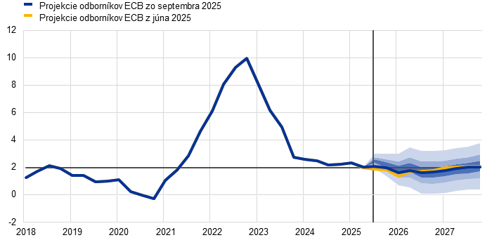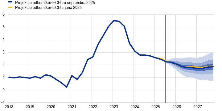 Výhľad inflácie je v súlade s jej stabilizáciou v blízkosti strednodobého cieľa na úrovni 2 %. Celková inflácia meraná harmonizovaným indexom spotrebiteľských cien (HICP) by sa mala počas zvyšku roka 2025 pohybovať stabilne okolo úrovne 2 %, v roku 2026 by mala klesnúť na 1,7 % a následne v roku 2027 vzrásť na 1,9 %. Pokles v roku 2026 odráža ďalšie postupné zmierňovanie neenergetických zložiek, pričom inflácia cien energií má zostať volatilná, ale v priebehu sledovaného obdobia má vzrásť, čiastočne v dôsledku zavedenia systému EÚ na obchodovanie s emisiami (ETS2) v roku 2027. Inflácia cien potravín by mala zostať spočiatku zvýšená, keďže sa do nej premietnu oneskorené účinky predchádzajúceho zvyšovania cien medzinárodných potravinových komodít, ale v rokoch 2026 a 2027 by sa mala mierne znížiť na úrovne mierne nad 2 %. Inflácia HICP bez energií a potravín (HICPX) má klesať vzhľadom na ústup mzdových tlakov a zmierňovanie inflácie cien služieb, ako aj zhodnocovanie eura, ktoré sa premietne do cenového reťazca a obmedzí infláciu cien tovarov. Nižší rast miezd po vyrovnaní predchádzajúcich strát reálnych príjmov v spojení s oživením rastu produktivity by mal viesť k výrazne pomalšiemu rastu jednotkových nákladov práce. V porovnaní s projekciami z júna 2025 bol výhľad celkovej inflácie HICP na roky 2025 a 2026 upravený o 0,1 percentuálneho bodu nahor v dôsledku vyššieho aktuálneho vývoja a predpokladov cien energetických komodít, ako aj oneskorených účinkov vyšších medzinárodných cien potravinových komodít, ktoré prevážili zhodnocovanie eura. V roku 2027 by mali prevládnuť oneskorené účinky zhodnocovania eura, čo vedie k revízii o 0,1 percentuálneho bodu nadol.