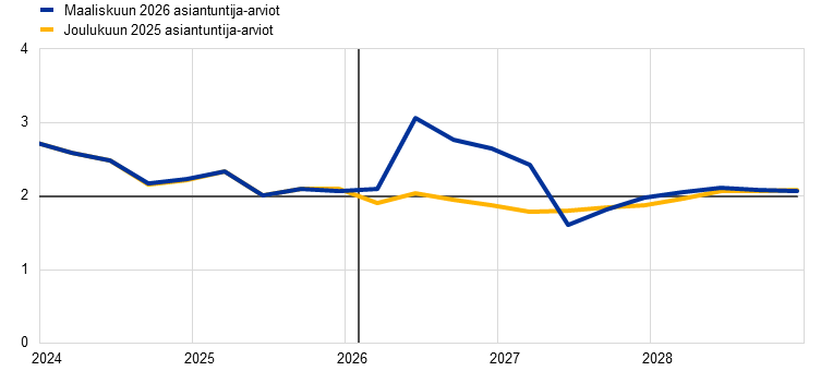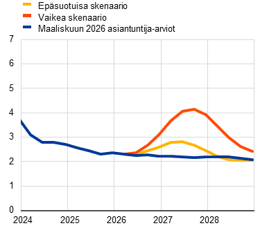 Yhdenmukaistetulla kuluttajahintaindeksillä (YKHI) mitatun inflaation arvioidaan nopeutuvan jyrkästi 3,1 prosenttiin vuoden 2026 toisella neljänneksellä, sillä Lähi-idän kriisi nopeuttaa voimakkaasti energian hintainflaatiota. Kolmannella vuosineljänneksellä inflaation arvioidaan hidastuvan 2,8 prosenttiin, koska energiaraaka-aineiden hintojen oletetaan laskevat futuurihintojen laskun myötä. Asiantuntija-arvioiden perusskenaarion mukaan energian hintainflaatio muuttuu negatiiviseksi vuonna 2027 pääasiassa energian hintakehitykseen liittyvien vertailuajankohdan vaikutusten vuoksi. Energiainflaation arvioidaan nopeutuvan huomattavasti vuonna 2028, jolloin EU:n ETS2-päästökauppajärjestelmän (ETS2) käyttöönoton odotetaan nopeuttavan kokonaisinflaatiota 0,2 prosenttiyksikköä. Elintarvikkeiden hintainflaation arvioidaan nopeutuvan vuoden 2026 lopulta lähtien, kun energian hintapiikkien aiheuttamat kustannuspaineet välittyvät elintarvikkeiden kuluttajahintoihin. Vuonna 2028 sen arvioidaan vaimenevan. Energian ja elintarvikkeiden hinnoista puhdistetun YKHI-inflaation arvioidaan maltillistuvan siten, että se on 2,4 % vuonna 2025 ja 2,1 % vuonna 2028. Energiahintojen noususta johtuvat kustannuspaineet vaikuttavat myös tähän YKHI-inflaatioon, mutta työvoimakustannuspaineiden lievän vähenemisen, euron aiemman vahvistumisen ja Kiinan tuonnin penetraation arvioidaan vaimentavan tätä vaikutusta. Perusskenaarion mukaan YKHI-inflaatio ensin nopeutuu vuoden 2025 aikaisesta 2,1 prosentista 2,6 prosenttiin vuonna 2026. Sitten se hidastuu 2,0 prosenttiin vuonna 2027 ja nopeutuu jälleen vuonna 2028, jolloin sen arvioidaan olevan 2,1 %. Palkkojen kasvu maltillistuu tulevina vuosina, tosin edellisissä asiantuntija-arvioissa ennakoitua hitaammin. Maltillisemman kasvun syynä ovat energian hintasokkiin liittyvän inflaatiokompensaation vaikutukset. Joulukuun 2025 asiantuntija-arvioihin verrattuna kokonaisinflaation näkymiä on tarkistettu 0,7 prosenttiyksikköä ylöspäin vuodelle 2026 lähinnä kokonaisinflaation energiaerän vuoksi. Arviota energiaerän kehityksestä on tarkistettu ylöspäin 0,2 prosenttiyksikköä vuodelle 2027 ja 0,1 prosenttiyksikköä vuodelle 2028. Syynä on energiahintojen noususta johtuvien kustannuspaineiden välittyminen energian ja elintarvikkeiden hinnoista puhdistettuun YKHI-inflaatioon ja elintarvike-eriin. Energiaerän kehitystä koskevia arvioita on tarkistettu sen sijaan jonkin verran alaspäin.