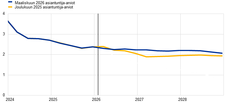 Viime vuoden lopulla euroalueen talous kasvoi 0,2 % eli joulukuun asiantuntija-arvioiden mukaisesti. Kasvu sai tukea kulutuksen ja julkisten investointien vahvistumisesta. Lyhyen aikavälin indikaattorien mukaan kasvuvire jatkui vuoden 2026 kahden ensimmäisen kuukauden aikana. Lyhyen aikavälin kasvunäkymiä on tarkistettu kuitenkin alaspäin Lähi-idän sodan vuoksi, sillä energian hintasokit ja epävarmuuden lisääntyminen todennäköisesti vaimentavat kulutusta ja investointeja. Kasvun hidastuminen jäänee tilapäiseksi, jos energiahinnat laskevat suhteellisen nopeasti energiaraaka-aineiden futuurimarkkinahintoja noudatellen ja jos epävarmuuskin vähenee suhteellisen ripeään tahtiin. Kotimainen kysyntä lienee edelleen tärkein euroalueen talouskasvua keskipitkällä aikavälillä vauhdittava tekijä. Kasvu saa tukea myös vahvoista työmarkkinoista sekä julkisten infrastruktuuri- ja puolustusmenojen lisäyksistä etenkin Saksassa. Viennin kasvun odotetaan piristyvän ulkomaisen kysynnän kohenemisen myötä, mutta euroalueen maailmanmarkkinaosuuksien supistuminen todennäköisesti jatkuu sitkeiden, osittain rakenteellistenkin kilpailukykyhaasteiden vuoksi ja huolimatta siitä, että Yhdysvaltoihin suuntautuvan viennin tullit ovat jonkin verran alemmat kuin joulukuun asiantuntija-arvioiden aikaan. Asiantuntija-arvioiden perusskenaarion mukaan euroalueen BKT kasvaa 0,9 % vuonna 2026, 1,3 % vuonna 2027 ja 1,4 % vuonna 2028. Lähi-idän sodan laajenemisen vuoksi BKT:n kasvuarvioita on tarkistettu alaspäin. Joulukuun 2025 asiantuntija-arvioihin nähden tarkistus on 0,3 prosenttiyksikköä vuonna 2026 ja 0,1 prosenttiyksikköä vuonna 2027. Vuotta 2028 koskeva arvio pysyy ennallaan.