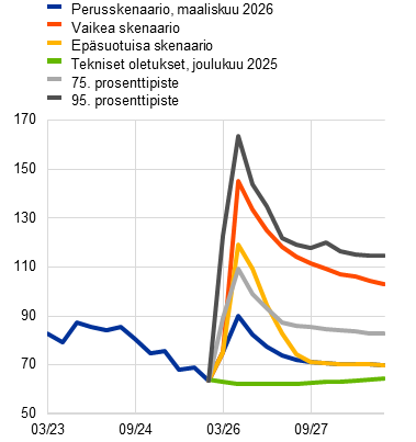 Lisäksi asiantuntijat ovat laatineet joitakin 4.3.2025 koottuihin teknisiin oletuksiin perustuvia arvioita (joihin sisältyvät tiedot Lähi-idän sodan alkamisen jälkeiseltä kolmelta ensimmäiseltä työpäivältä). Niissä näkymät ovat suotuisammat: vuoden 2026 toisella neljänneksellä öljyn hinnan oletetaan olevan korkeimmillaan 79 Yhdysvaltain dollaria barrelilta ja kaasun hinnan 48 euroa megawattitunnilta.[2] Näissä suotuisammissa arvioissa vuoden 2026 inflaatio on 0,3 prosenttiyksikköä hitaampi ja vuosien 2027 ja 2028 inflaatio 0,1 prosenttiyksikköä hitaampi kuin lopullisessa perusskenaariossa. Talouskasvu on puolestaan kunakin arviointijakson vuotena 0,1 prosenttiyksikköä nopeampi kuin lopullisessa perusskenaariossa.