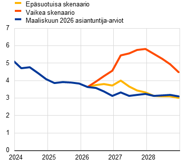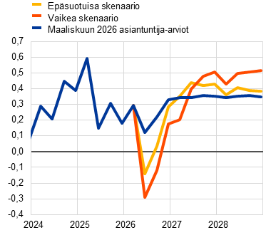 Vaikeassa skenaariossa energiahinnoilla oletetaan olevan voimakkaampi ja pitkäkestoisempi vaikutus, johon yhdistyvät lisääntyneen epävarmuuden vaikutukset. BKT:n kasvu on 0,5 prosenttiyksikköä hitaampaa vuonna 2026 ja 0,4 prosenttiyksikköä hitaampaa vuonna 2027. Neljännesvuosikasvu on negatiivista vuoden 2026 toisella ja kolmannella neljänneksellä (ks. kuvion 14 kohta a). Vaikka energiasokki on edelleen tärkein tekijä, myös epävarmuus vaikuttaa laskusuhdanteeseen ja voimistaa sitä globaalien heijastusvaikutusten ohella. YKHI-inflaatio on 1,8 prosenttiyksikköä nopeampaa vuonna 2026, ja se pysyy korkealla ollen perusskenaarioon nähden 2,8 prosenttiyksikköä nopeampaa vuonna 2027 ja 0,7 prosenttiyksikköä nopeampaa vuonna 2028. Vuosina 2027–2028 vaikutukset energia- ja elintarvikehinnoista puhdistettuun YKHI-inflaatioon ovat yli prosenttiyksikön voimakkaampia kuin epäsuotuisassa skenaariossa.