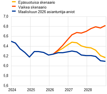 Perusskenaarion lisäksi asiantuntijat ovat laatineet hypoteettisia vaihtoehtoskenaarioita, joissa on erilaisia oletuksia energian hintasokin voimakkuudesta ja kestosta, hintasokin vaikutuksesta kansainväliseen toimintaympäristöön ja epävarmuuteen sekä sen leviämisestä välillisten vaikutusten ja kerrannaisvaikutusten kautta. Vaihtoehtoskenaarioissa on havainnollisia esimerkkejä energiaraaka-aineiden hintojen mahdollisista kehityskuluista ja niiden välittymisestä euroalueen talouteen. Asiantuntijat eivät määritä skenaarioille todennäköisyyksiä vaan skenaarioiden tarkoituksena on pikemminkin korostaa konfliktin vaikutuksiin liittyviä keskeisiä epävarmuustekijöitä. Kuten yleensäkin asiantuntija-arvioissa, skenaariot havainnollistavat vaikutuksia, joita euroalueen talouteen voi kohdistua, jos viranomaiset eivät ryhdy perusskenaarioon sisältyvien toimien lisäksi muihin raha- tai finanssipoliittisiin toimiin. Epäsuotuisaan skenaarioon sisältyy perusskenaariota voimakkaampia välillisiä vaikutuksia ja kerrannaisvaikutuksia, joiden tarkoituksena on tuoda esiin mahdollista epälineaarisuutta siinä, miten energian alkuperäinen hintasokki leviää muihin hintoihin taloudessa. Siinä oletetaan energiahintojen nousevan paljon jyrkemmin kuin perusskenaariossa. Lisäksi siinä oletetaan, että epävarmuus ja haitalliset kansainväliset heijastusvaikutukset (kuten ulkomaisen kysynnän väheneminen) kasvavat. Vuoden 2026 toisella neljänneksellä öljyn hinnan oletetaan olevan korkeimmillaan 119 Yhdysvaltain dollaria barrelilta ja kaasun 87 dollaria megawattitunnilta, ja hintojen oletetaan lähestyvän perusskenaarion oletuksia vuoden 2027 kolmanteen neljännekseen mennessä. Perusskenaarioon verrattuna epäsuotuisassa skenaariossa inflaatio on 0,9 prosenttiyksikköä nopeampi vuonna 2026 ja 0,1 prosenttiyksikköä nopeampi vuonna 2027 mutta 0,5 prosenttiyksikköä hitaampi vuonna 2028, jolloin energiahintojen oletetaan normalisoituvan nopeasti ja luovan inflaatioon hidastumispainetta. Talouskasvu on sen sijaan hitaampaa kuin perusskenaariossa vuosina 2026 ja 2027 mutta sitä nopeampaa vuonna 2028. Vaikeassa skenaariossa oletetaan, että energian hintasokki on voimakkaampi ja pitkäaikaisempi, epävarmuus on suurempaa ja välilliset ja kerrannaisvaikutukset voimakkaampia kuin epäsuotuisassa skenaariossa. Vaikeassa skenaariossa öljyn hinnan oletetaan olevan korkeimmillaan 145 Yhdysvaltain dollaria barrelilta ja kaasun hinnan 106 euroa megawattitunnilta vuoden 2026 toisella neljänneksellä. Sen jälkeen näiden hintojen oletetaan laskevan paljon hitaammin ja pysyvän arviointijakson loppuun asti huomattavasti korkeampina kuin perusskenaariossa ja epäsuotuisassa skenaariossa. Vaikeassa skenaariossa kokonaisinflaatio on koko arviointijakson ajan huomattavasti ja sitkeästi nopeampaa kuin perusskenaariossa (1,8 prosenttiyksikköä vuonna 2026, ja 2,8 prosenttiyksikköä vuonna 2027 sekä 0,7 prosenttiyksikköä vuonna 2028). Taulukosta 1 käy ilmi merkittävä ero epäsuotuisan skenaarion (1,6 %) ja vaikean skenaarion (2,8 %) mukaisen inflaation välillä vuonna 2028. Tämä osoittaa, että konfliktin kehittymisellä, energian toimitushäiriöillä ja hintasokin välittymismekanismien koolla on suuri merkitys määritettäessä konfliktin vaikutusta keskipitkän aikavälin inflaatioon. Vuosina 2026–2027 talouskasvu olisi 0,4–0,5 prosenttiyksikköä hitaampaa kuin perusskenaariossa, minkä jälkeen se vahvistuisi ja olisi 0,5 prosenttiyksikköä perusskenaariota nopeampaa vuonna 2028. Talouden oletetaan siis kasvavan voimakkaammin arviointijakson loppua kohti, sillä tulojen ja kysynnän kasvun oletetaan vahvistuvan, kun edellisinä vuosina nopeutunut inflaatio johtaa palkkojen kasvuun.