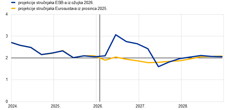 Predviđa se da će inflacija mjerena harmoniziranim indeksom potrošačkih cijena (HIPC) u drugom tromjesečju 2026. naglo porasti na 3,1 % potaknuta naglim rastom inflacije cijena energije zbog krize na Bliskom istoku te da će se zatim u trećem tromjesečju smanjiti na 2,8 % nakon smanjenja cijena energenata ugrađenih u terminske cijene. U osnovnim se projekcijama predviđa da će inflacija cijena energije postati negativna u 2027. uglavnom zbog negativnih baznih učinaka te se znatno povećati u 2028. zbog provedbe sustava EU‑a za trgovanje emisijama 2 (ETS2), čiji bi pozitivni utjecaj na ukupnu inflaciju trebao iznositi 0,2 postotna boda. Predviđa se da će inflacija cijena hrane prvo rasti od kraja 2026. kako se troškovni pritisci koji proizlaze iz naglog porasta cijena energije budu prenosili na potrošačke cijene hrane te da će se potom smanjiti u 2028. Inflacija mjerena HIPC‑om bez energije i hrane trebala bi se smanjiti s 2,4 % u 2025. na 2,1 % u 2028. Iako na inflaciju mjerenu HIPC‑om bez energije i hrane utječu i troškovni pritisci koji proizlaze iz viših cijena energije, smatra se da njih donekle neutraliziraju slabljenje pritisaka troškova rada, prethodna aprecijacija eura i prodor uvoza iz Kine. Općenito gledajući, u osnovnim projekcijama predviđa se da će se inflacija mjerena HIPC‑om povećati s 2,1 % u 2025. na 2,6 % u 2026. te da će se potom smanjiti na 2,0 % u 2027. i porasti na 2,1 % u 2028. Rast plaća smanjivat će se u sljedećim godinama, iako sporije nego što je predviđeno u prethodnim projekcijama zbog određenih učinaka naknada za inflaciju povezanih sa šokom cijena energije. U odnosu na projekcije iz prosinca 2025. izgledi za ukupnu inflaciju mjerenu HIPC‑om revidirani su naviše za 0,7 postotnih bodova za 2026. uglavnom zbog komponente energije. Revidirani su naviše za 0,2 postotna boda za 2027. i za 0,1 postotni bod za 2028. jer se troškovni pritisci koji proizlaze iz viših cijena energije prenose na inflaciju mjerenu HIPC‑om bez energije i hrane te na komponente hrane a komponenta energije revidirana je malo naniže.