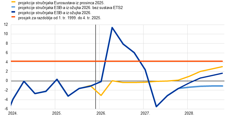 Napomene: Povijesni podatci mogu se razlikovati od najnovijih Eurostatovih podataka. Početak sadašnjeg projekcijskog razdoblja označen je okomitom crtom. U grafikonu projekcije nisu prikazane s rasponima neizvjesnosti zbog toga što uobičajeni izračun lepezastih grafikona (na temelju pogreški iz prošlih projekcija) u sadašnjim okolnostima ne bi bio pouzdan pokazatelj visoke razine neizvjesnosti povezane s ovim projekcijama. Umjesto toga, radi bolje ilustracije trenutačne neizvjesnosti, u odjeljku 3. opisani su alternativni scenariji u kojima se pretpostavljaju različiti stupnjevi snage gospodarskog učinka rata na Bliskom istoku.