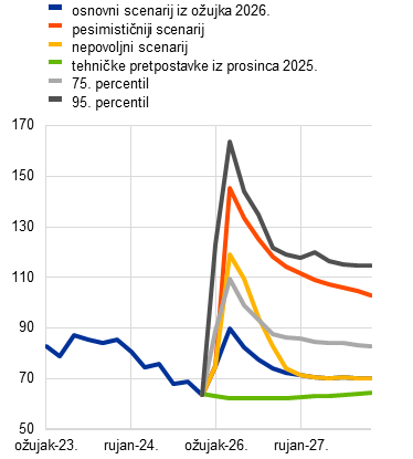 Naposljetku, skup projekcija koje se temelje na tehničkim pretpostavkama s krajnjim datumom 4. ožujka (pri čemu su uzete u obzir informacije o prvim trima radnim danima nakon početka rata na Bliskom istoku) upućuje na povoljnije izglede: pretpostavlja se da će cijene nafte i plina dosegnuti najvišu razinu od 79 USD po barelu odnosno 48 EUR po megavatsatu u drugom tromjesečju 2026.[2] U skladu s tim projekcijama inflacija bi bila za 0,3 postotna boda niža od konačne osnovne projekcije u 2026. i za 0,1 postotni bod niža u 2027. i 2028. Rast bi bio za 0,1 postotni bod viši u svakoj godini projekcijskog razdoblja.