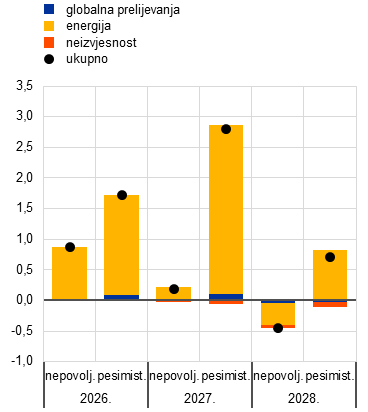 U pesimističnijem scenariju pretpostavlja se da će cijene energije imati snažniji i dugotrajniji učinak te da će ih pratiti učinci povećane neizvjesnosti. Rast realnog BDP‑a niži je za 0,5 postotnih bodova u 2026. i za 0,4 postotna boda u 2027., pri čemu su tromjesečne stope rasta u drugom i trećem tromjesečju 2026. negativne (Grafikon 14., dio a)). Iako je šok cijena energije i dalje glavni činitelj, određenu ulogu ima i neizvjesnost, koja zajedno s globalnim prelijevanjima pojačava pad. U odnosu na osnovni scenarij inflacija mjerena HIPC‑om viša je za 1,8 postotnih bodova u 2026., za 2,8 postotnih bodova u 2027. i za 0,7 postotnih bodova u 2028. Učinak na inflaciju mjerenu HIPC‑om bez energije i hrane snažniji je nego u nepovoljnom scenariju, i to za više od 1 postotnog boda u 2027. i 2028.